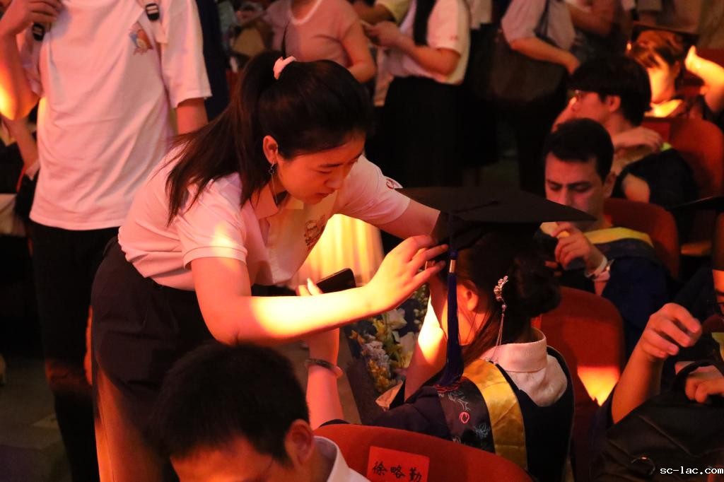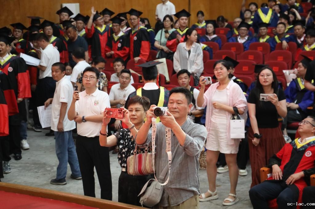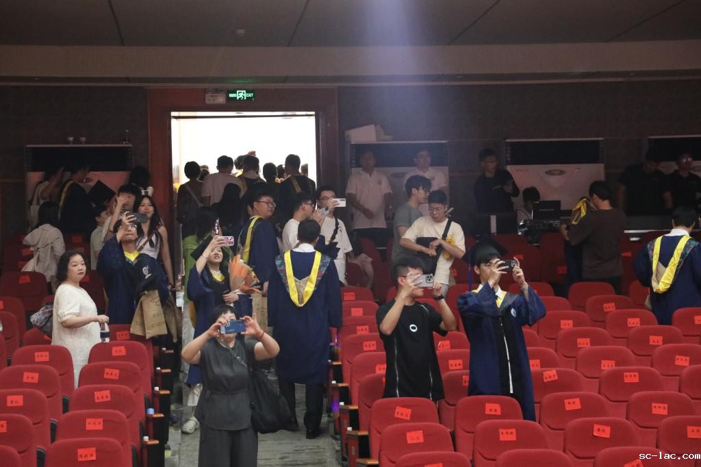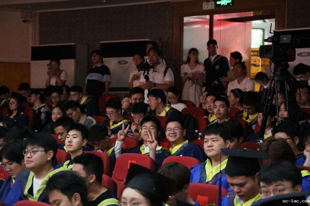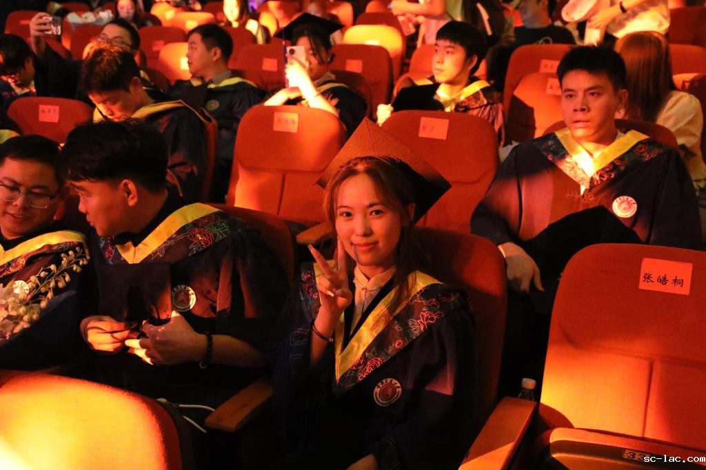 流光穿梭,镜头捕捉,一张张笑脸如花般在典礼现场绚烂绽放。硕士服在灯光映照下泛着深邃的蓝光,有的挥舞着星点灯光,有的挥动荧光棒,青春的蓬勃气息在快门轻按的刹那定格为永恒。那些欢笑声仿佛插上了翅膀,在镜头内外轻盈盘旋。