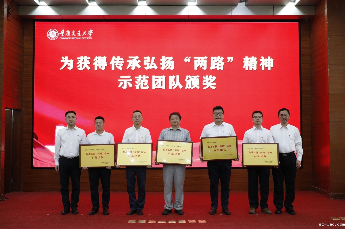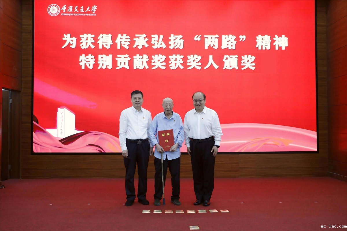 “传承弘扬‘两路’精神特别贡献奖”的颁发成为全场焦点。当主持人宣布这一奖项时,全场肃然起敬。宫辉、赖远明共同将这一沉甸甸的荣誉授予了冉超同志。冉超同志数十年如一日,潜心挖掘、研究,传承弘扬“两路”精神,用“心”用“情”讲好交大人的奋斗故事,是“两路”精神薪火相传的杰出代表。这份荣誉不仅是对个人毕生奉献的崇高礼赞,更是对“两路”精神这一重庆交大最鲜明文化标识和宝贵精神财富的高度珍视与传承决心的彰显。