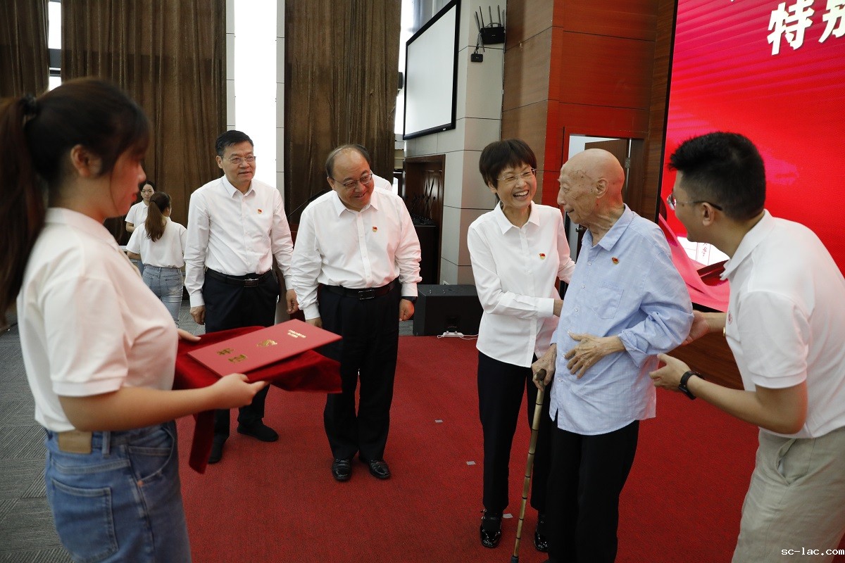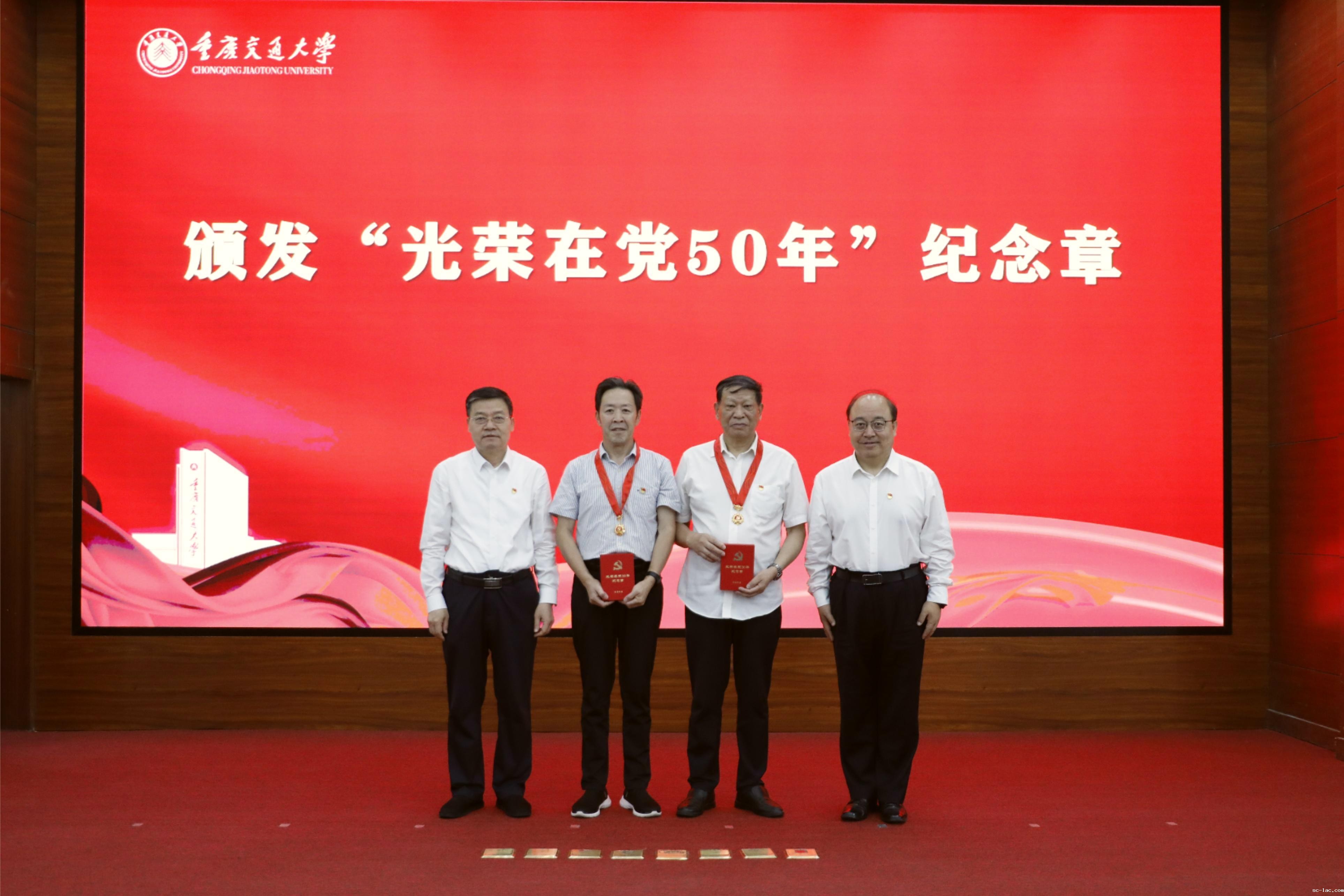 在激昂的乐曲声中,校领导逐一为获奖集体和个人代表颁发奖牌、证书,并为老党员代表佩戴“光荣在党50年”纪念章。全场以热烈的掌声向受到表彰的先进集体、个人以及为党辛勤奉献五十余年的老党员们致以崇高敬意。