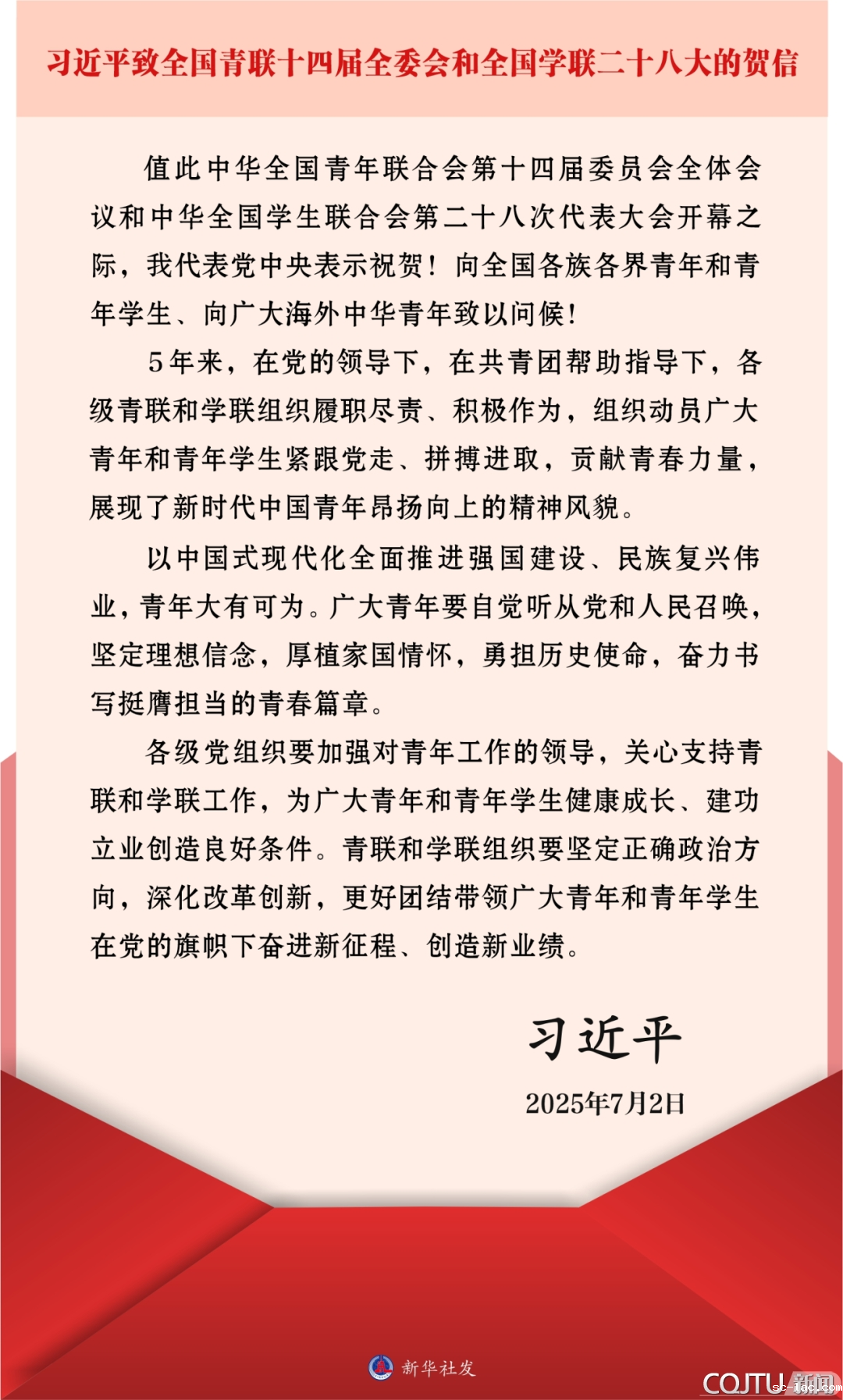 中华全国青年联合会第十四届委员会全体会议、中华全国学生联合会第二十八次代表大会7月2日上午在京开幕。中共中央总书记、国家主席、中央军委主席习近平致贺信,向全国各族各界青年和青年学生、向广大海外中华青年致以问候。