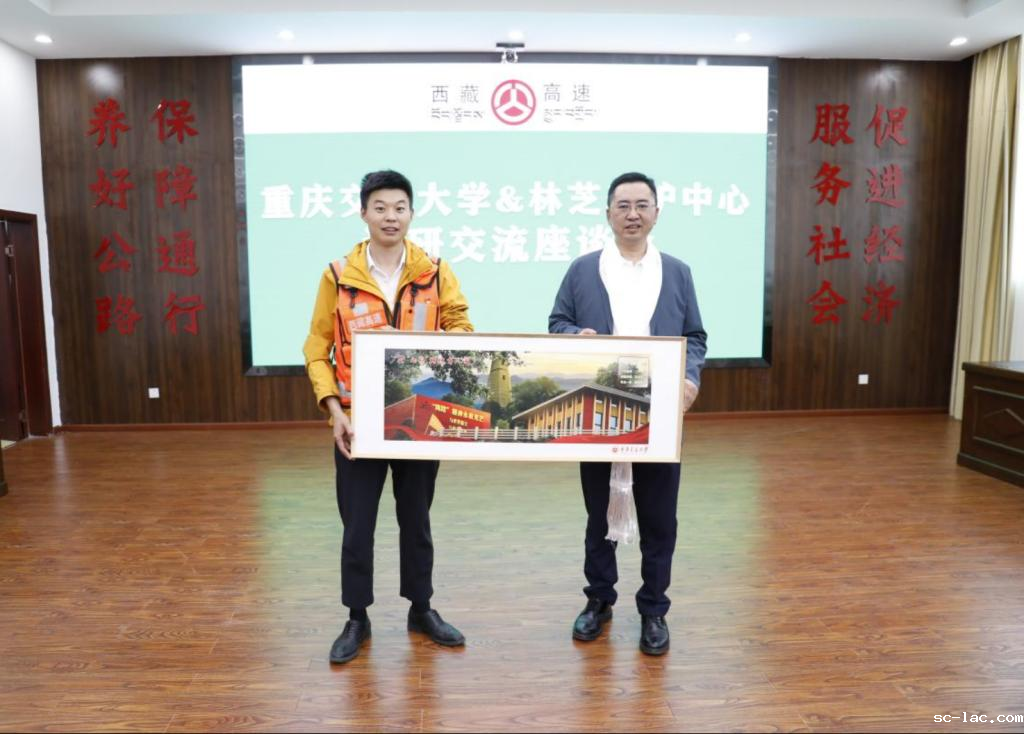任海涛代表学校向西藏高速林芝养护中心赠送了“两路”精神的文创品。