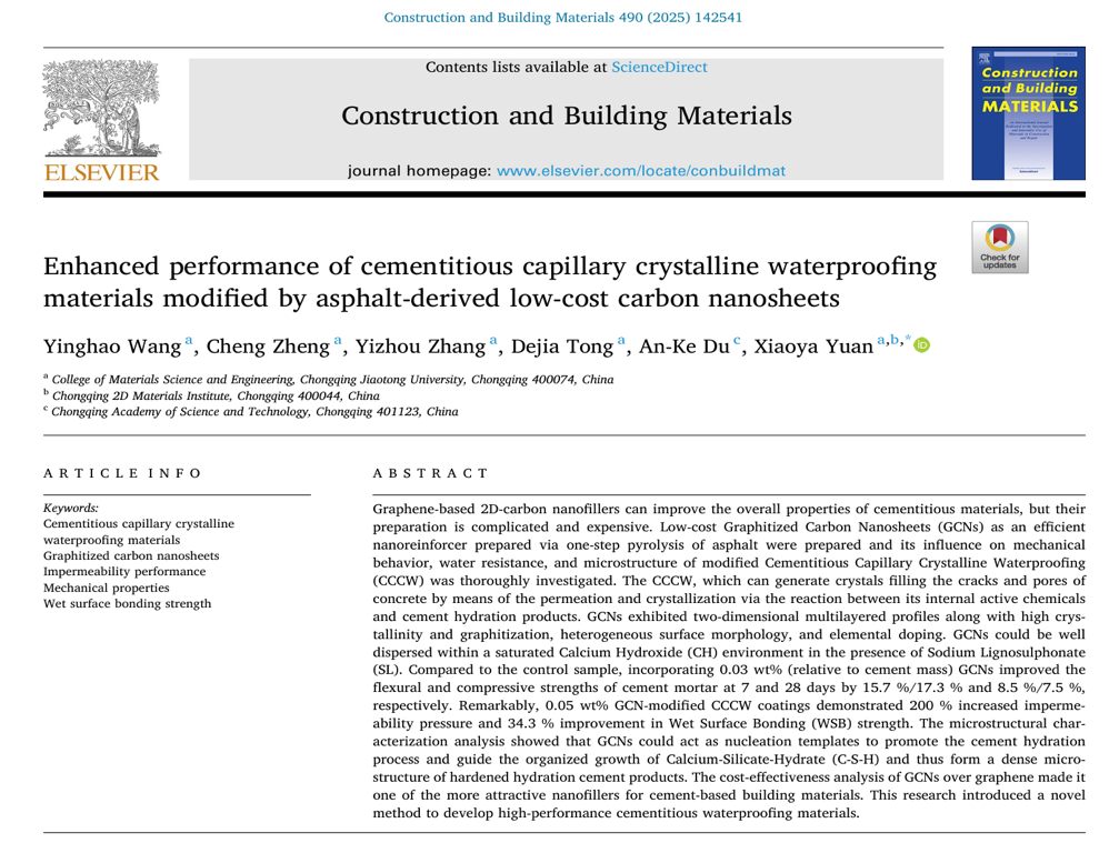 整个暑期,学院科研成果持续涌现:硕士研究生王迎豪(导师袁小亚)在中科院一区Top期刊发表论文,以沥青衍生碳纳米片改良水泥基防水材料,使抗渗压力提升200%,为建筑防水技术突破提供新路径。