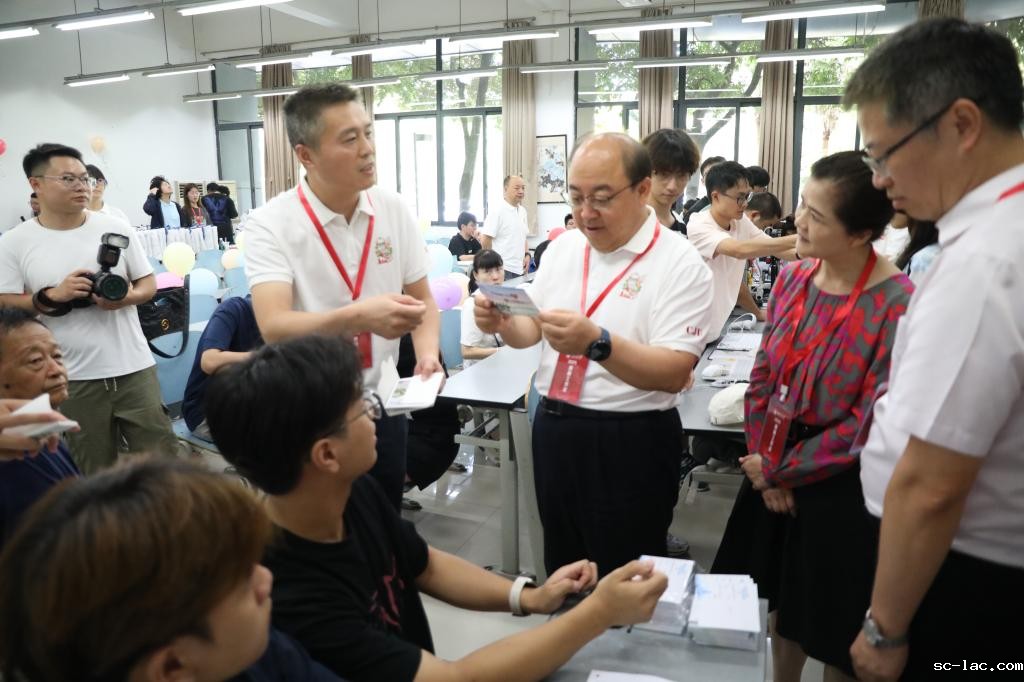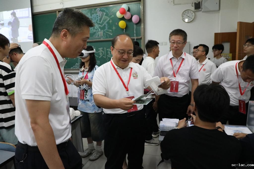 走进A01教学楼各学院报到点,校领导一行仔细查看为新生准备的各类特色文创迎新礼品,并与新同学们合影留念。
