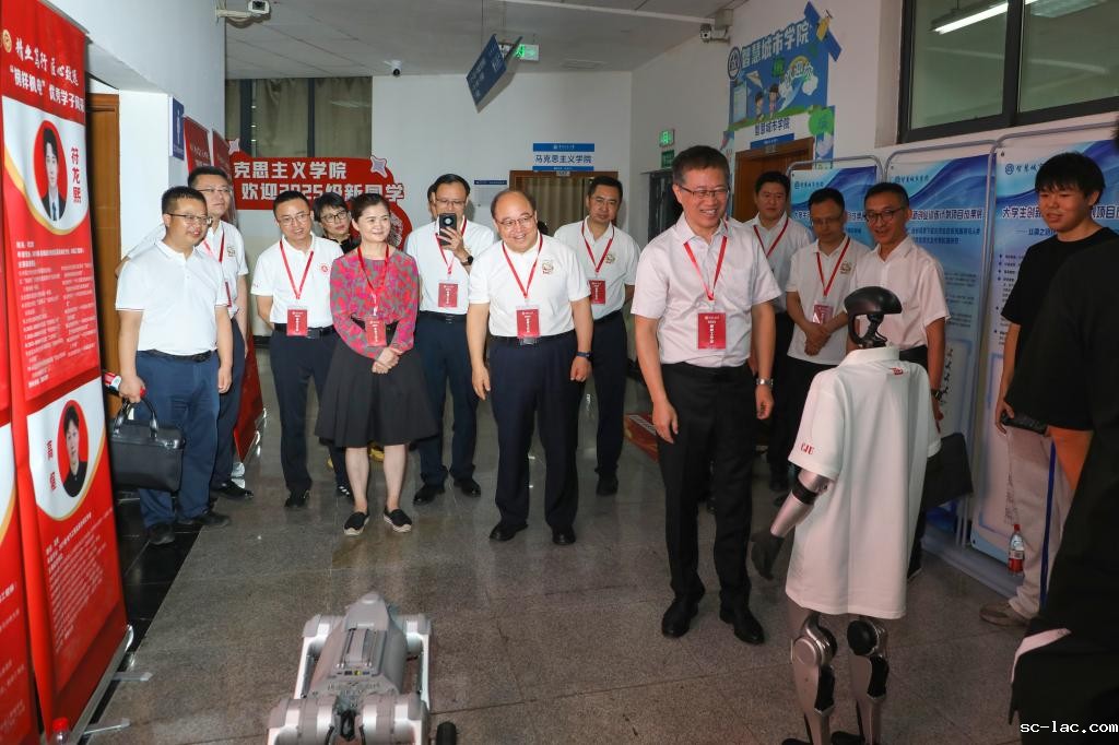 在机电学院和信息学院迎新点,一场生动的科技展示正在上演。灵活的升级版机器人随着指令做出各种动作,宇树机器人平稳行走、转身,与大家挥手、握手……校领导一行驻足观看,详细询问技术细节和应用前景。“科技赋能教育,创新引领未来”,宫辉书记强调,要让新生从一开始就感受到交大的学术氛围和创新文化,激发他们的科研兴趣与探索精神。
