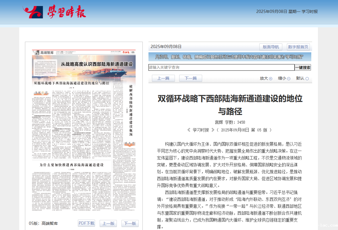构建以国内大循环为主体、国内国际双循环相互促进的新发展格局,是以习近平同志为核心的党中央洞察时代大势、把握发展全局作出的重大战略决策。在这一宏伟蓝图下,建设西部陆海新通道作为一项重大战略工程,不仅是交通物流领域的突破,更是牵动区域协调发展、扩大对外开放格局、保障国家战略安全的深远谋划。在当前双循环背景下,明确战略地位、破解发展瓶颈、优化推进路径,是推动西部陆海新通道高质量发展的内在要求,对服务国家大局、促进区域协调发展和提升国际竞争优势具有重大战略意义。