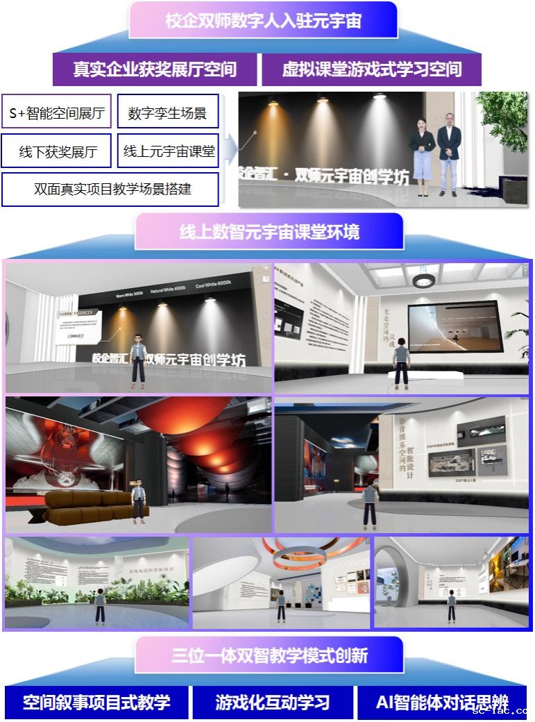 案例将企业真实智能展厅——全球KNX Award获奖展厅进行数字孪生,构建成线上元宇宙创学坊,打造了一座“可搭建、可探索、可创造”的项目式学习中枢与产教融合创新基地。 学生像游戏开发者般自主操控、沉浸探索AIGC辅助设计的全流程;教师转型为“学习设计师”进行任务设计与引导;“AI作为副驾”提供海量方案与建议,形成“师-生-机”三元协同。课程内容对接重庆萨维尔科技真实项目,企业导师以虚拟形象进入课堂,与学生在元宇宙中零距离互动,实现企业项目“零时差”融入教学。