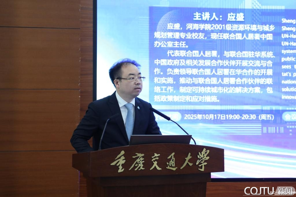 10月17日下午,河海学院2001级资源环境与城乡规划管理专业杰出校友、联合国人居署中国办公室主任应盛受邀回到母校,作为主讲嘉宾出席老伟德网上娱乐第95期明德讲坛并作《从交大出发:二十年后的回望与思考》专题讲座。讲座上,应盛结合成长经历,立足全球视野,深情回顾了在重庆交大的学习岁月,分享了母校教育对其职业道路的深远影响。校党委常委、宣传部部长叶勇主持讲坛,相关职能部门及各学院师生代表100余人现场聆听。