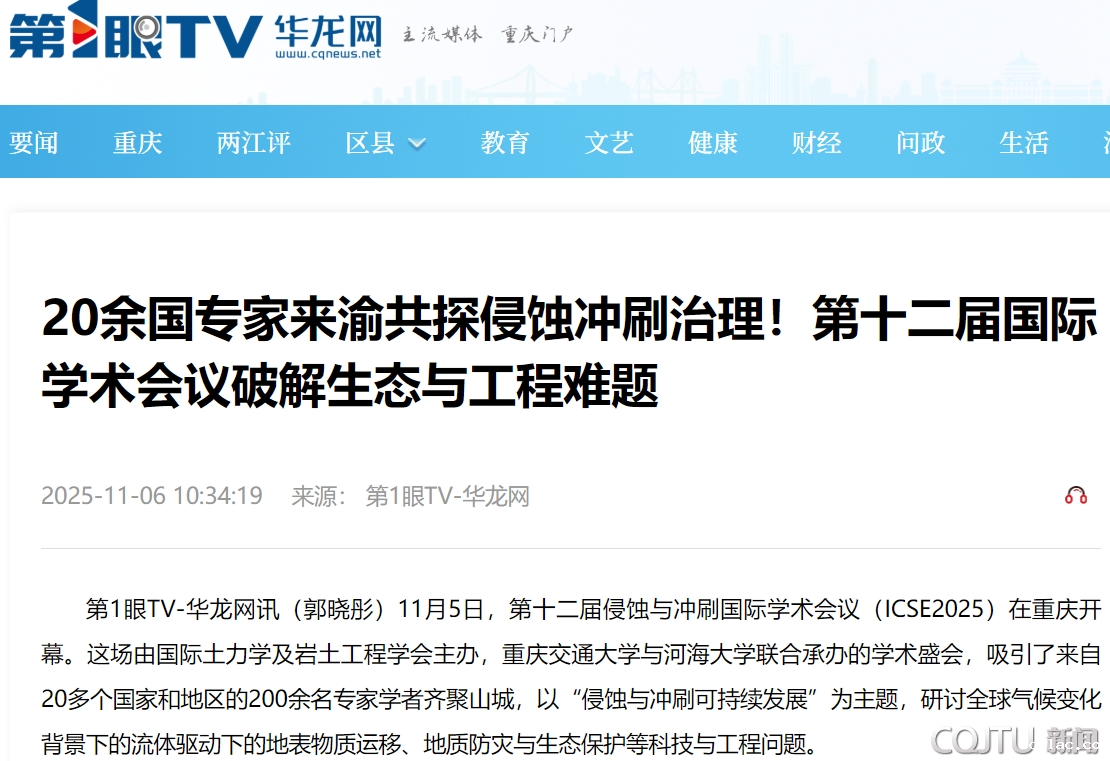 第1眼TV-华龙网讯(郭晓彤)11月5日,第十二届侵蚀与冲刷国际学术会议(ICSE2025)在重庆开幕。这场由国际土力学及岩土工程学会主办,老伟德网上娱乐与河海大学联合承办的学术盛会,吸引了来自20多个国家和地区的200余名专家学者齐聚山城,以“侵蚀与冲刷可持续发展”为主题,研讨全球气候变化背景下的流体驱动下的地表物质运移、地质防灾与生态保护等科技与工程问题。