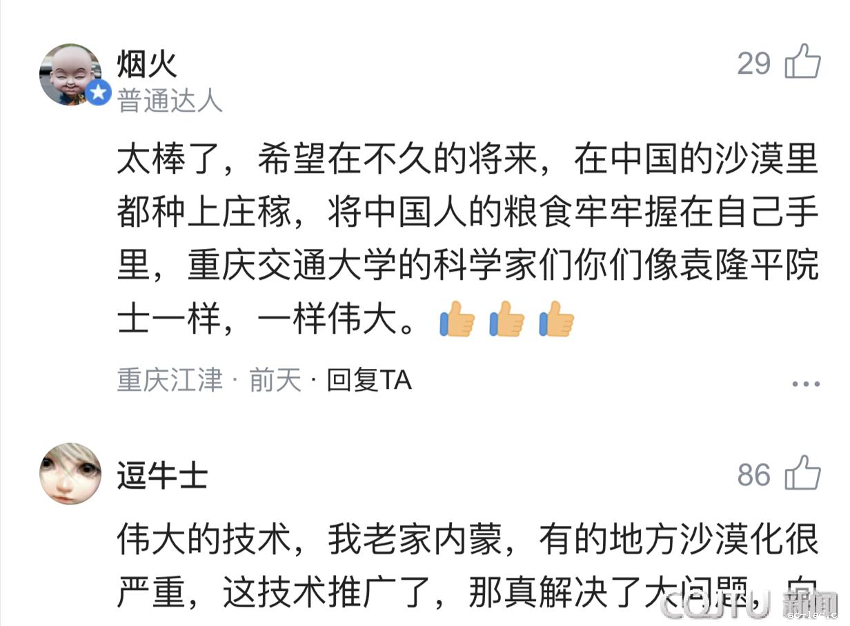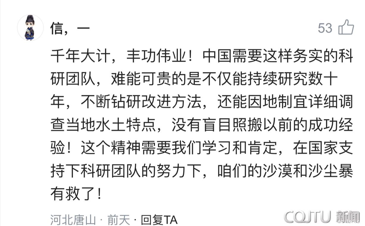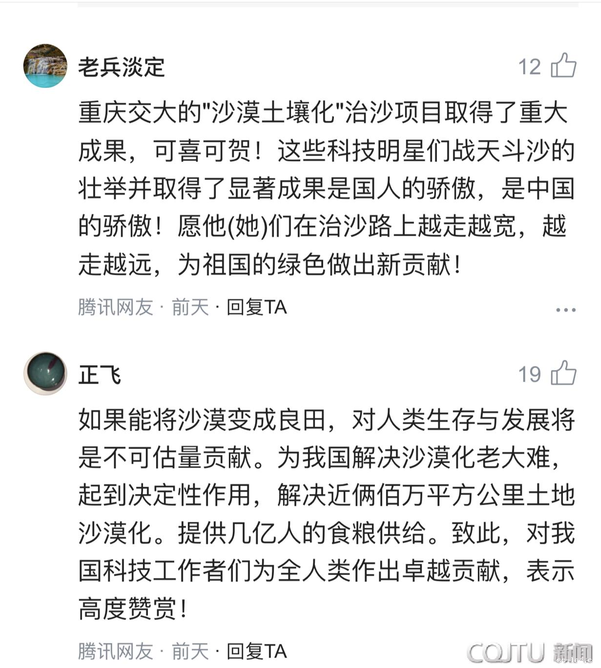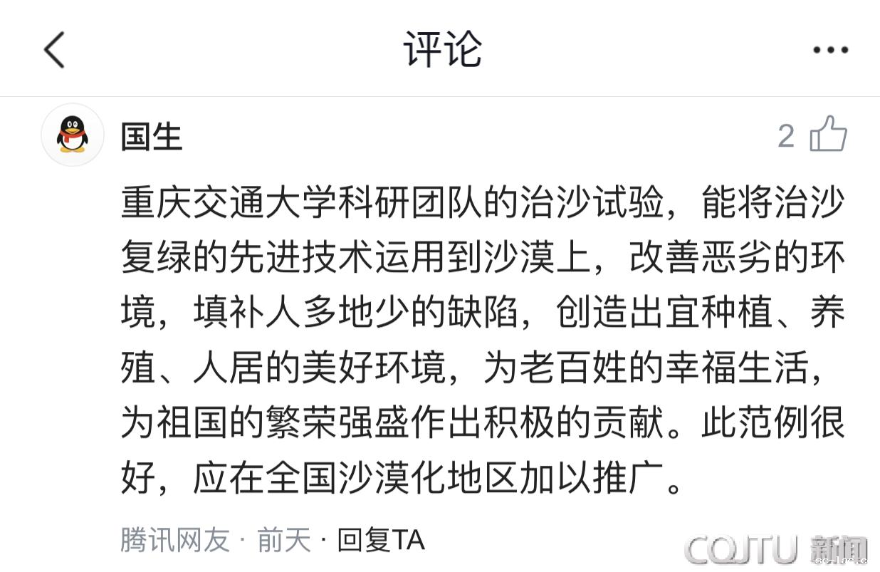 该视频新闻一上线,很快就刷爆了朋友圈。不少网友纷纷为学校科研团队点赞,同时也对这项技术的可持续性发展、经济效益及成本等问题进行了探讨。网友们纷纷推荐转发:“老伟德网上娱乐科研团队的治沙试验,能将治沙复绿的先进技术运用到沙漠上,改善恶劣的环境,创造出宜种植、养殖、人居的美好环境,为老百姓的幸福生活,为祖国的繁荣富强做出了积极贡献。”“为老伟德网上娱乐的科研人员点赞,感谢他们造福中国、造福人类的努力和成果”“看得我眼泪都掉下来了,我们西北人应该感到幸福,因为有这些默默付出和守护的科研工作者。”……截止到3月8日12时,网友跟帖评论达15000余条。