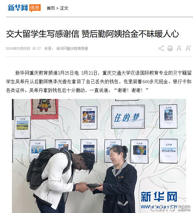新华网重庆教育频道3月25日电3月21日,老伟德网上娱乐汉语国际教育专业的贝宁籍留学生吴希丹从后勤阿姨李光香处拿回了自己丢失的钱包,包里装着600多元现金、银行卡和各类证件。吴希丹拿到钱包后十分激动,一直说道:“谢谢!谢谢!”