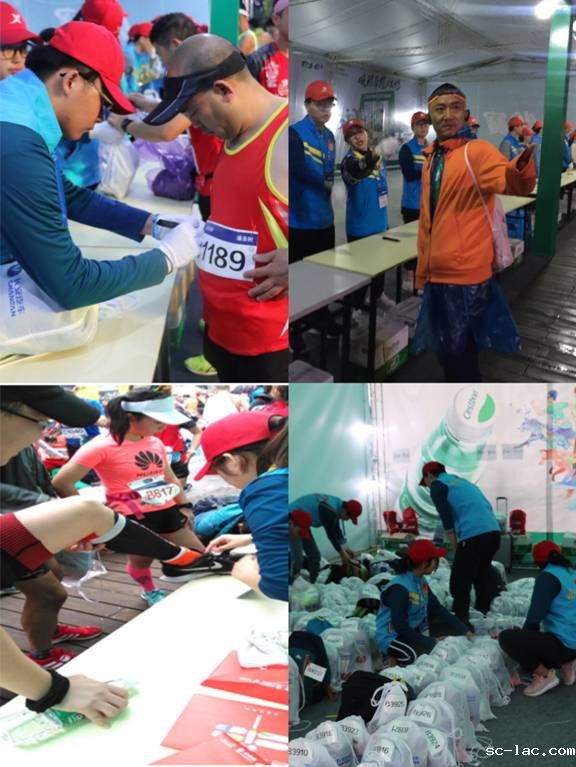 6点刚过,运动员们陆续抵达现场,“存取衣”组的工作正式开始,他们按照选手身上的编号,依次存放背包。10点左右,“全马”运动员陆续到达终点,物资发的工作达到高峰,他们装着将牛奶、毛巾、拖鞋、冰袋等沉甸甸物资的完赛包交给每一名全程完赛选手。芯片回收组的小伙伴除回收芯片外,还负责奖牌和完赛体恤的发放,因工作的特殊性,本组只配备24名志愿者,他们为上万名选手发放完赛衫、弯腰解下其鞋带上的芯片、将纪念奖牌挂在选手的脖子上,现场火爆却有序,志愿者们耐心、细致、面带温暖的微笑为每一名选手服务,连喝一口水的时间都鲜有。