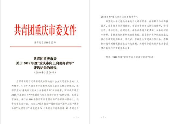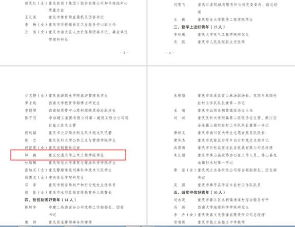 近日,共青团重庆市委员会发布《关于2018 年度“重庆市向上向善好青年”评选结果的通报》(渝青发[2019]22号文),我校土木学院钟鹏从全市各地、各行业推荐的400名人选中脱颖而出,获评“勤学上进好青年”荣誉称号。