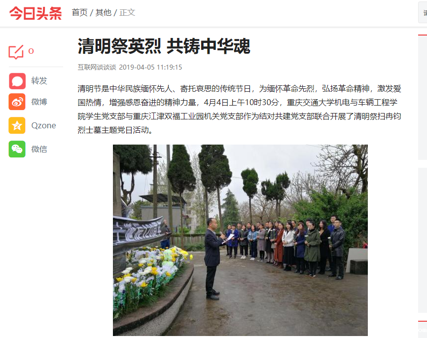 清明节是中华民族缅怀先人、寄托哀思的传统节日,为缅怀革命先烈,弘扬革命精神,激发爱国热情,增强感恩奋进的精神力量,4月4日上午10时30分,老伟德网上娱乐机电与车辆工程学院学生党支部与重庆江津双福工业园机关党支部作为结对共建党支部联合开展了清明祭扫冉钧烈士墓主题党日活动。机电学院党委副书记王滔韬,院团委书记苏婧参加此次活动。