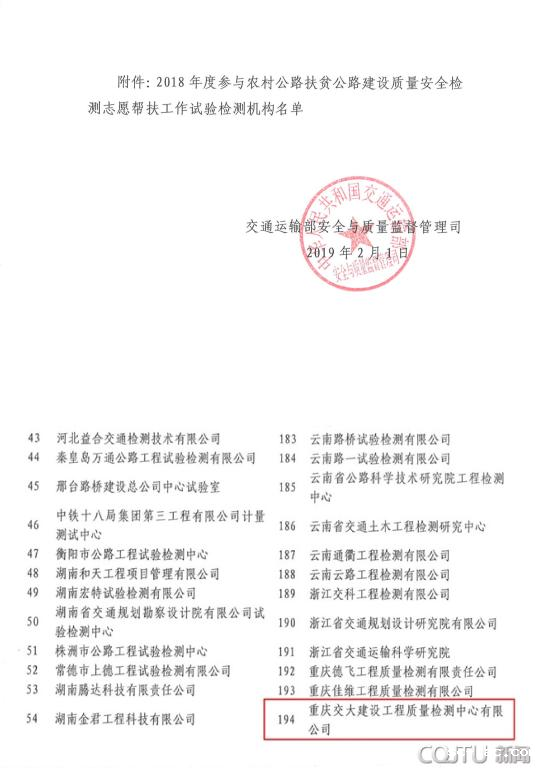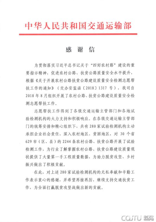 近日,国家交通运输部公开发出《感谢信》,对在2018年农村公路、扶贫公路建设质量安全检测志愿帮扶工作中做出贡献的280家试验检测机构表示感谢。重庆交大建设工程质量检测中心有限公司参与并顺利完成了7条农村公路(共计21.0公里)的检测,受到表扬。