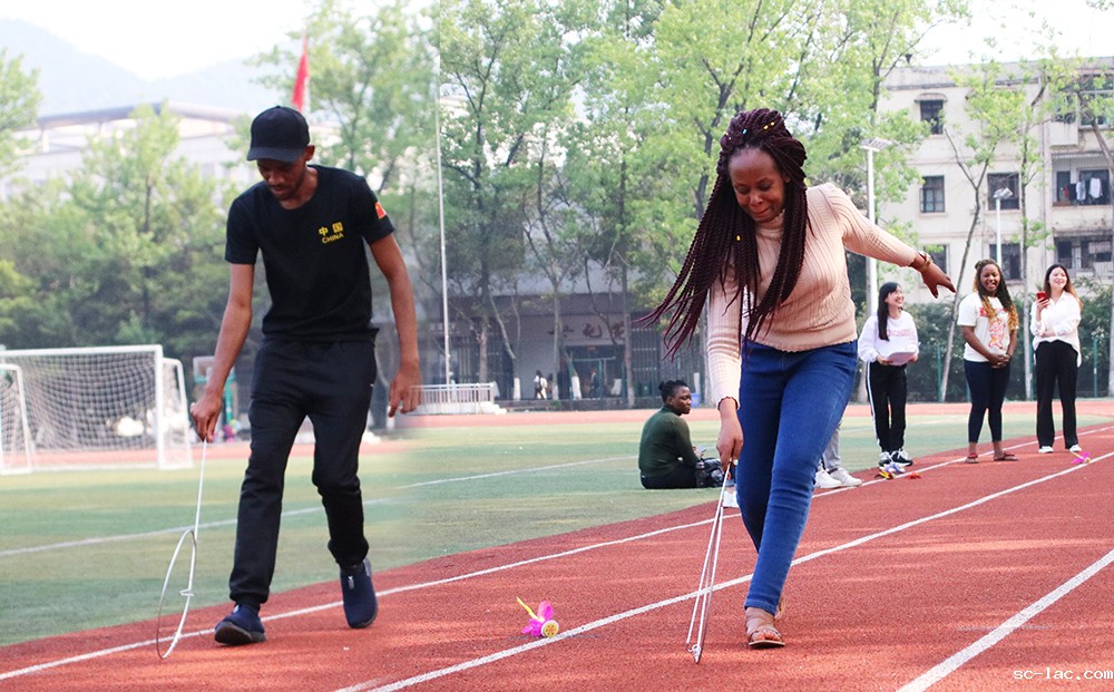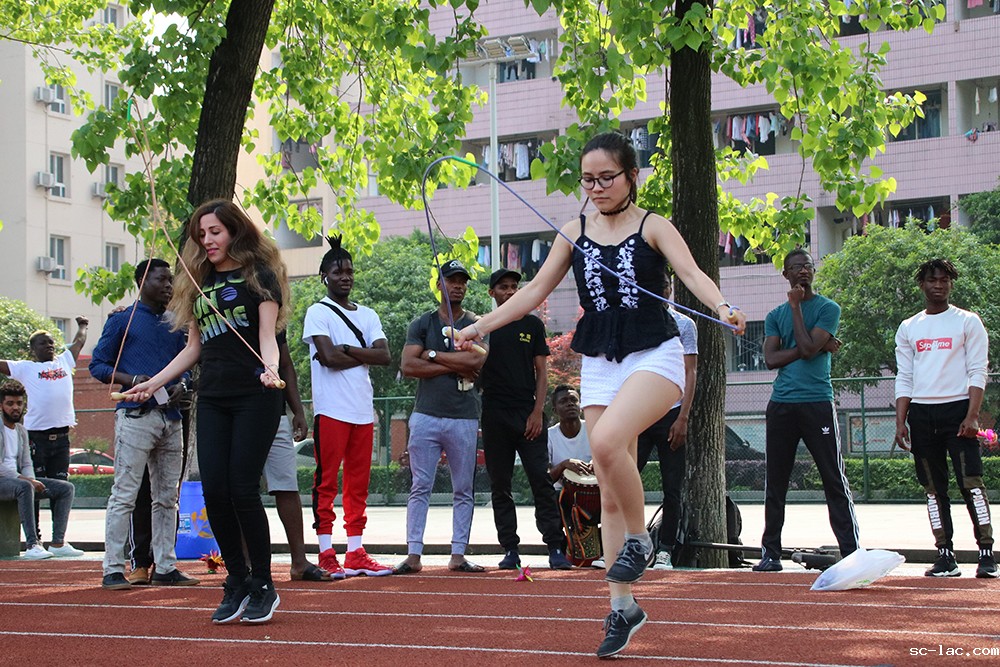 活动一开始,老师先宣布规则,并进行示范。留学生跟着老师一起,迅速地掌握要领,愉快地比拼起来。投壶掷箭项目考验的是细心和耐心,参赛同学稳扎稳打,逐渐熟练起来;踢毽子是中国的传统游戏,当踢毽子遇上留学生,产生了奇妙的化学反应,他们以独特的脚法,将踢毽子这个项目成功拿下;滚铁环环节,短短几分钟,同学们对这个游戏从不熟悉到上手;跳绳项目,老师和留学生共同参与,其乐融融。两个小时后,活动在师生们的欢声笑语中画上了圆满的句号。