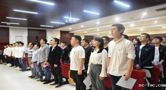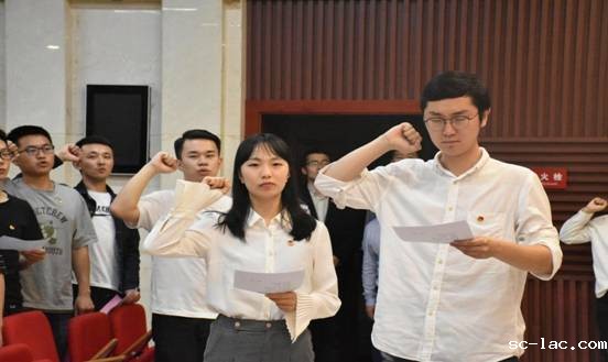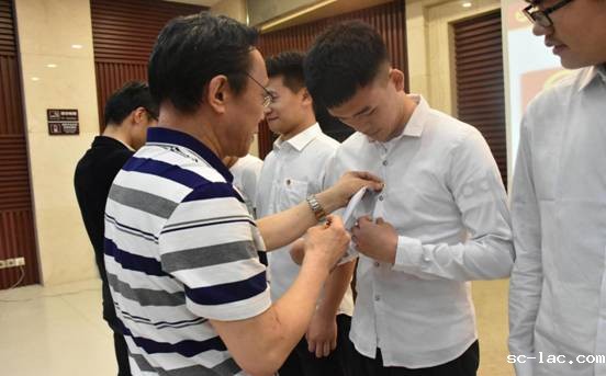 全体成员宣读入团誓词后,刘剑鸣老师、李洪波老师、向巍老师、苗国厚老师分别为新团员佩戴团徽。