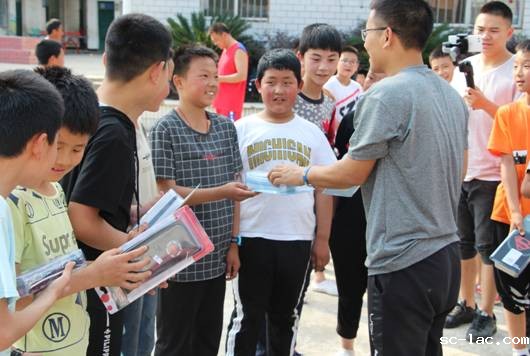 比赛结束后,老师和大学生哥哥们将带来的文具盒赠送给参加活动的每位小朋友,作为他们参与此次篮球活动的纪念品,也是一份六一儿童节的礼物,同时,将自费购买的篮球、羽毛球、乒乓球、跳绳、水彩笔等文体用品送给了铁甲村小学,作为孩子们公共的体育文化用品。