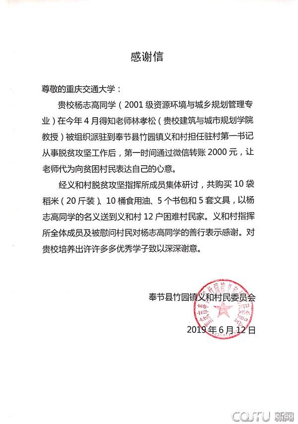 近日,学校收到了奉节县竹园镇义和村民委员会发来的一份感谢信。信中说,今年4月建筑与城市规划学院林孝松教授被组织派驻到奉节县竹园镇义和村担任驻村第一书记,从事脱贫攻坚工作,他的学生2001级资源环境与城乡规划管理专业杨志高得知此事后,第一时间通过微信转账2000元,让老师代为向贫困村民表达自己的心意。