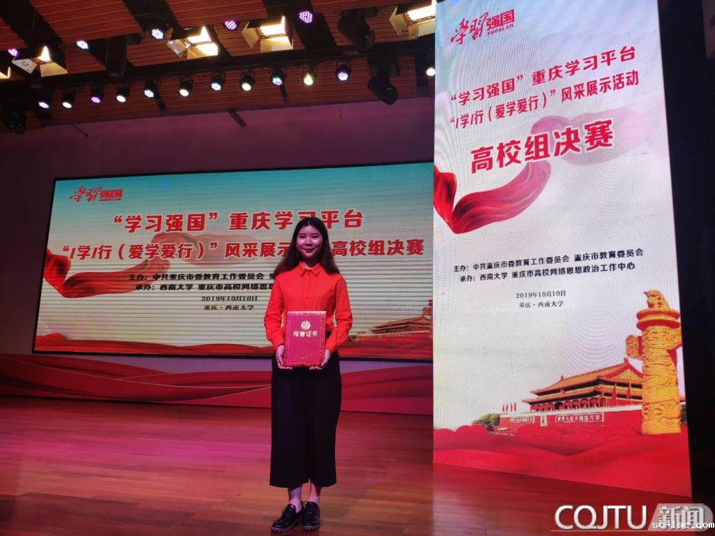 本赛事历经校选赛、重庆市初赛和决赛三个环节,决赛包括主题演讲和现场知识竞答两个环节。决赛竞争非常激烈,20名决赛选手有高校的思政课教师、思政工作处级干部、党支部书记、研究生党员,仅有2名本科生。王思琪同学决赛演讲的主题是《学习强国,让我更爱我的国》;比赛中她不畏强手,自信、阳光、担当的表现,赢得了现场观众的热烈喝彩和点评嘉宾的赞扬,展现了交大学子的优秀风采。