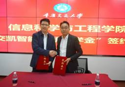 学院副院长(主持工作)杨建喜代表学院与江西飞尚科技有限公司及四位校友就设立“江西飞尚助学奖学金”“文华励志奖学金”“交凯智能创新奖学金”“水滴励志奖学金”签署合作协议。