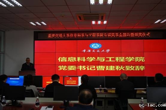 信息学院党委书记曹建秋致辞,诚挚感谢江西飞尚科技有限公司及校友们对学院建设发展、学子成长成才给予的关心和支持。
