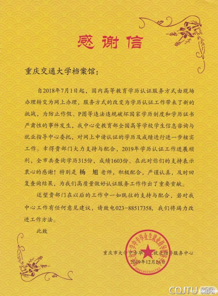 近日,学校档案馆收到了重庆市大学中专毕业生就业指导服务中心发来的感谢信。对我校为其网上申请认证的学历及成绩核实工作提供的支持与配合表示衷心的感谢。信中提到,特别是档案馆杨旭老师积极配合,严谨认真的工作作风,为学历及成绩认证服务作出了重要贡献。