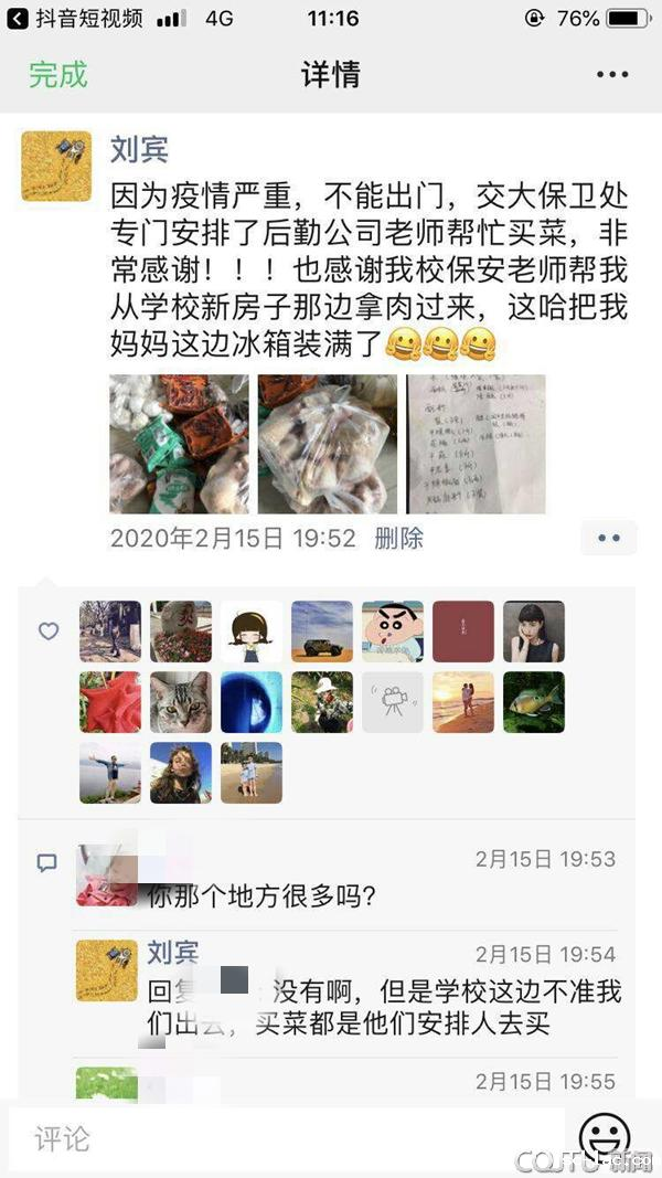 “火锅底料两包,盐两袋,大蒜,猪肉……”2月15日,双福,大雨,因疫情滞留在双福校区的刘某某、蔡某某夫妇及其女儿刘宾拿到了后勤分公司党员干部黄健(分公司总经理)冒雨帮他们代买的生活必需品,心怀感激的刘宾专门发了一个朋友圈:“因为疫情严重,不能出门,交大保卫处专门安排了后勤公司老师帮忙买菜,非常感谢!!”刘某某、蔡某某是西科所向家坝实验项目部临聘人员,疫情爆发后,双福校区严格按照上级和学校部署要求,对校区居住人员进行了拉网式排查,他们发现除应急值守校区的安保和后勤人员外,还住有6位重庆建工、中冶建工及向家坝项目的临聘人员及家属。
