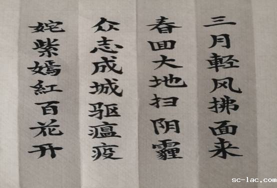 交大教职工书协副会长王瑞燕赋诗一首:“三月轻风拂面来,春回大地扫阴霾;众志成城驱瘟疫,姹紫嫣红百花开。”为全国抗“疫”行动加油,为全校师生抗“疫”行动鼓劲。