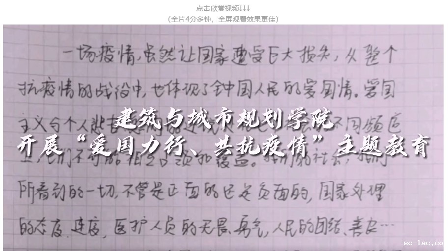 新冠肺炎疫情发生以来,建筑与城市规划学院积极组织学生开展“爱国力行、共抗疫情”主题教育活动,录制“以歌致敬,以爱抗‘疫’”视频,向奔赴一线的医务人员、解放军战士和抗“疫”工作者表达最诚挚的敬意。全院100余名学生线上参与该项活动,反响激烈,学生们纷纷表示:愿同祖国携手一起,唱响人间大爱,期待风雨彩虹。
