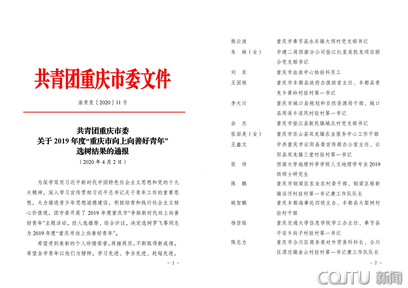 近日,共青团重庆市委员会发布了《关于2019年度“重庆市向上向善好青年”选树结果的通报》(渝青发[2020]11号文)。我校信息学院学工办主任、奉节县平安乡向子村驻村第一书记杨登陆同志坚守贫困地区,持续开展扶贫助困志愿服务,带动奉节县平安乡村支两委及全村干部群众开展精准脱贫,获评2019年度“重庆市向上向善好青年——扶贫助困好青年”荣誉称号。
