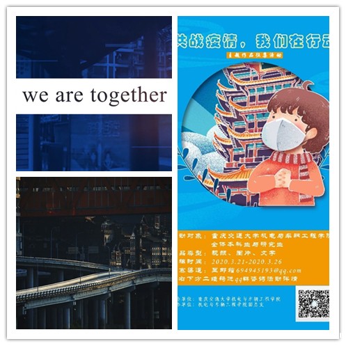 为进一步加强爱国主义教育,培养学生爱国主义精神,激发学生的爱国情操,机电学院开展了“共战疫情,我们在行动”主题活动,旨在引导学生对疫情的关注和对自身的思考,激发他们的爱国情怀,展现激昂的精神面貌,同时向奋战在一线的英雄们致敬。在线征集相关主题的作品,分为图片、视频、文字三大类。本次活动共有22组参赛作品,13574人参与了投票。
