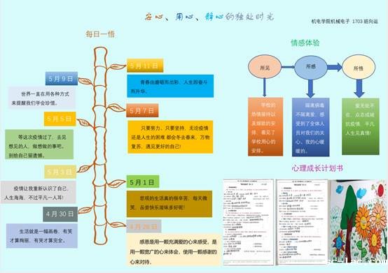 在“安心、用心、静心的独处时光——14天心理成长计划”活动中,同学们积极参与“心理成长计划书”、“我手画我心”的活动,纷纷感受在独处时内心的焦虑变成坦然、懈怠变得自律的心理历程。数十份视频,数百份彩色小报,体现了大家在疫情中的各种“心”体验、“心”成长。