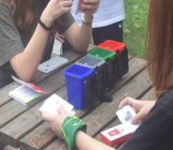 活动当天,志愿者们精心准备了垃圾分类小道具,一共有4个“垃圾桶”——有害垃圾、可回收垃圾、厨余垃圾、其他垃圾,若干张写有常见垃圾名称的卡片,号召同学们参与小游戏;通过思考卡片上的垃圾名称,将卡片放入对应的垃圾桶中,一共有10次机会,答对一次记1分;依据分数高低,可对应获得纪念小扇子、中性笔、驱蚊贴等小礼品。