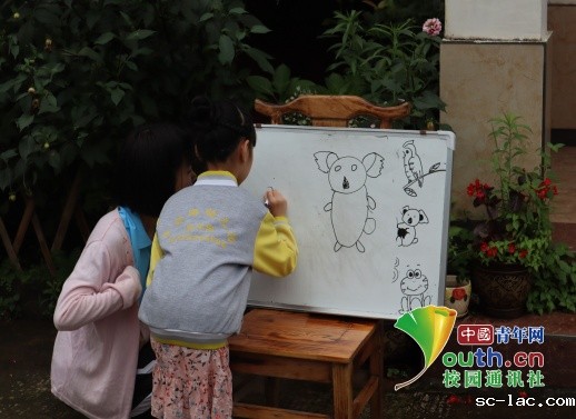 小朋友在实践队队员郝铭敏的带领下画出新组最喜爱的动物。中国青年网通讯员 陈烨 摄