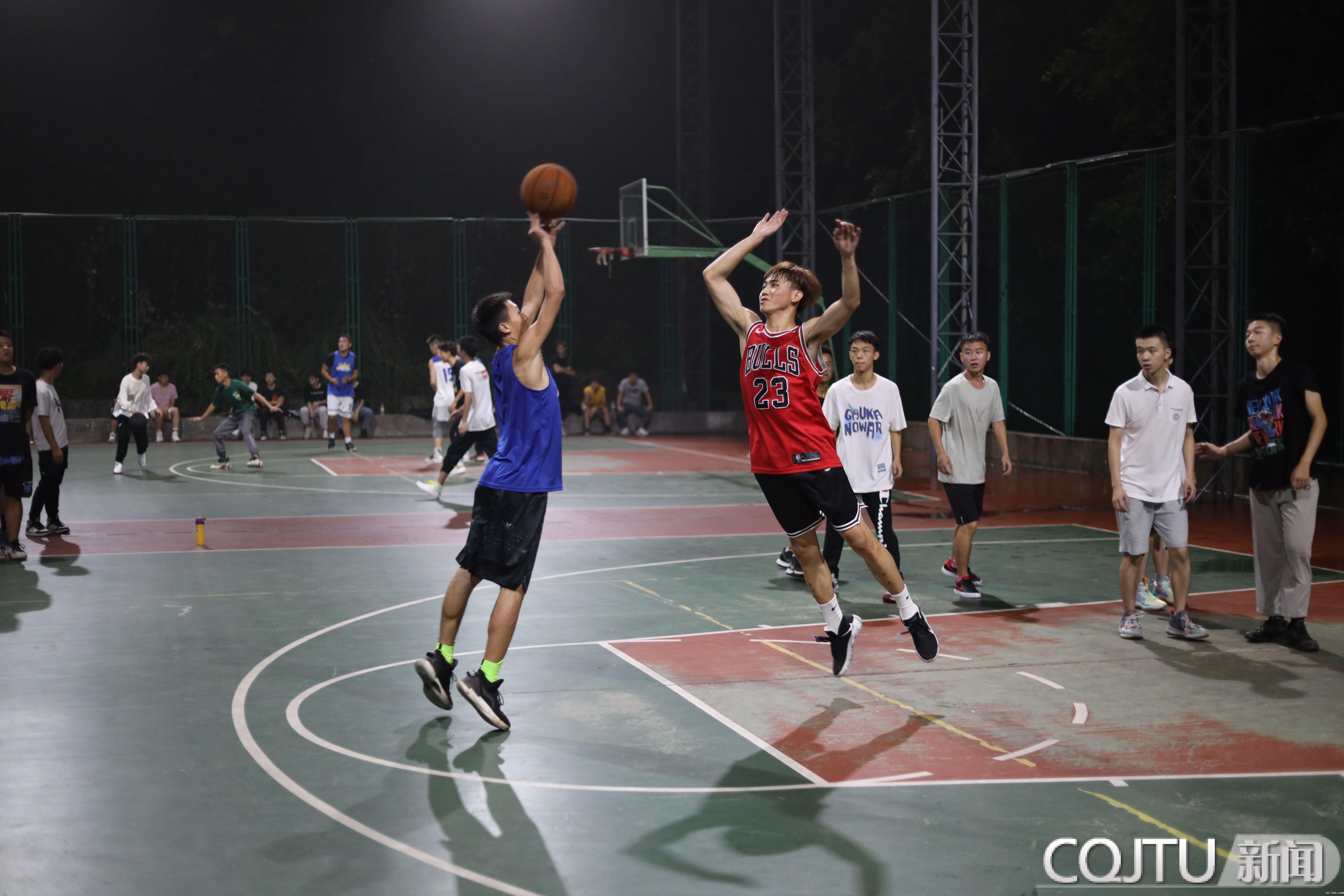 篮球场外,围观大一新生与大二老生之间“友谊篮球赛”的同学们站足了一排。学弟同学长们在球场上挥洒汗水,球迷观众们也不时为场上的精彩进球大声喝彩!