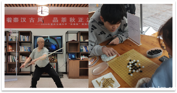 活动还特地邀请了太极剑资深爱好者郑伟老先生表演太极剑。同学们在老先生的一招一式间体悟了阴阳、太极抽象又神秘的深邃涵义。在“你说我猜”、以及围棋、象棋、五子棋教学体验中,同学们都踊跃参与,乐在其中。