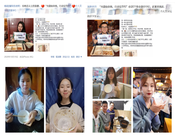 人文学院通过在新媒体平台公布自己与“光盘”的合影,并向同学发起“光盘”挑战的方式吸引学生参与,学生纷纷晒照积极回应挑战;外语学院、数统学院、材料学院、航运学院等也通过网络开展“晒光盘”行动,从真正意义上实现了师生联动和深入贯彻学习,调动了学生的参与积极性,引导同学们自觉践行“光盘行动”。