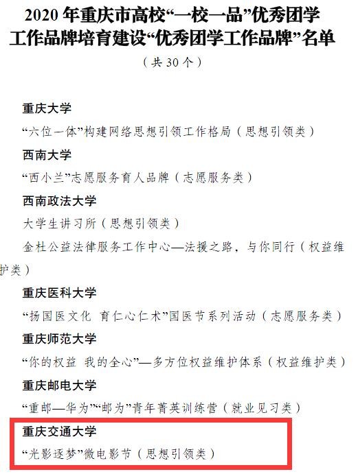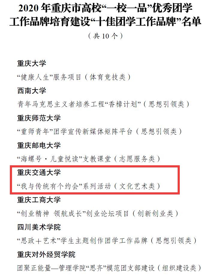 近日,共青团重庆市委、市学联通报了2020年重庆市高校“一校一品”十佳(优秀)团学工作品牌名单,我校“我与传统有个约会”系列活动项目荣获“十佳团学工作品牌”、“光影逐梦”微电影节项目获评“优秀团学工作品牌”。
