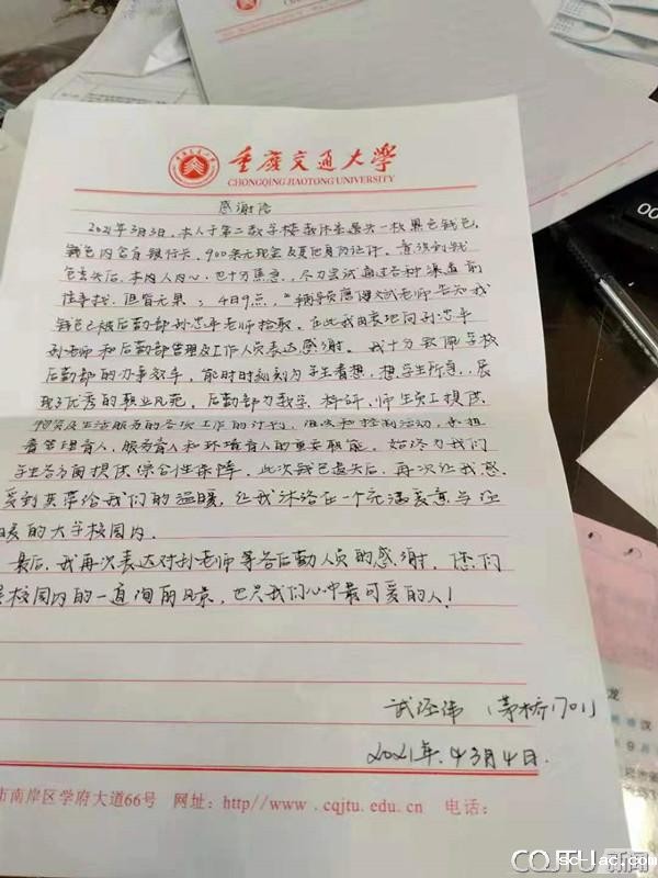 “3月3日,本人于第二教学楼遗失了一个黑色钱包,内有银行卡、900元现金及其他身份证件。意识到钱包丢失后,我内心十分焦虑,尽力通过各种渠道找寻无果,4日,辅导员告知我钱包被后勤老师捡到了。在此,我由衷地向后勤老师们表示由衷地感谢。”3月5日前后,我校后勤服务总公司物管分公司物管一部经理孙忠平陆续收到了三封感谢信,信中对员工们拾金不昧的精神表示了深深的感谢。