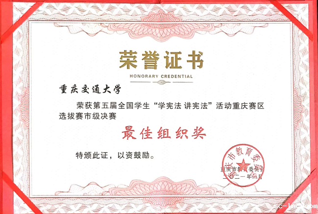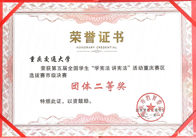 近日,重庆市教育委员会通报了第五届学生“学宪法讲宪法”活动获奖情况,我校荣获“最佳组织奖”、“团体二等奖”,经济与管理学院2019级龚洲尼同学荣获知识竞赛二等奖、航运与船舶工程学院2019级孙竞一同学荣获演讲比赛三等奖,宋子荣、张颜荣获“优秀指导教师奖”。