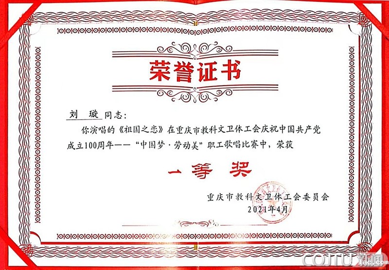 决赛中,刘璇老师发挥出色,其优美的歌声、稳健的台风赢得了评委和观众的一致赞誉,荣获一等奖的好成绩。后期刘璇老师还将代表市教科文卫体工会参加重庆市产业工会的比赛。