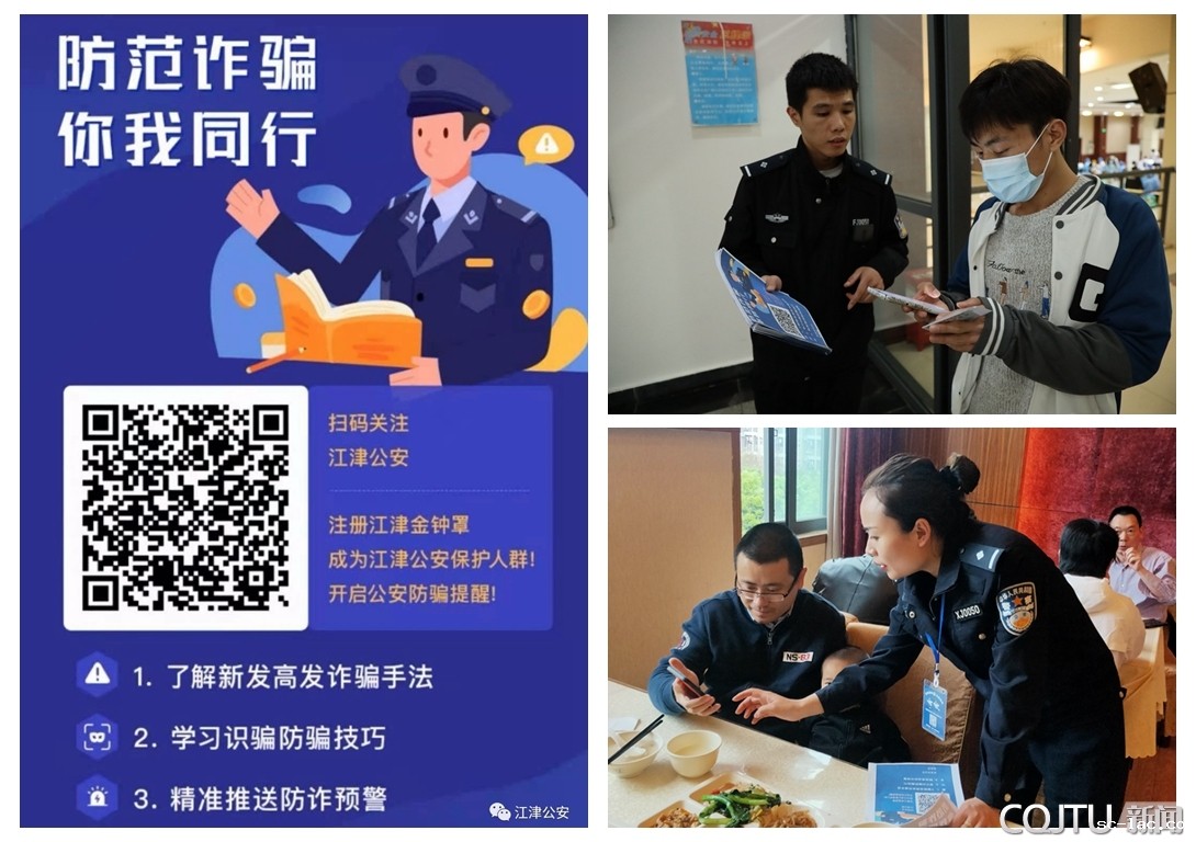 科学城校区积极协调邀请反诈民警进校,利用学生上下课、就餐高峰期间和集中、集体活动期间,进食堂、进寝室、进活动现场为师生开展反诈宣传教育,发放相关宣传资料。同时,积极配合属地公安机关推广反诈利器“江津金钟罩”小程序,守护师生“钱袋子”。