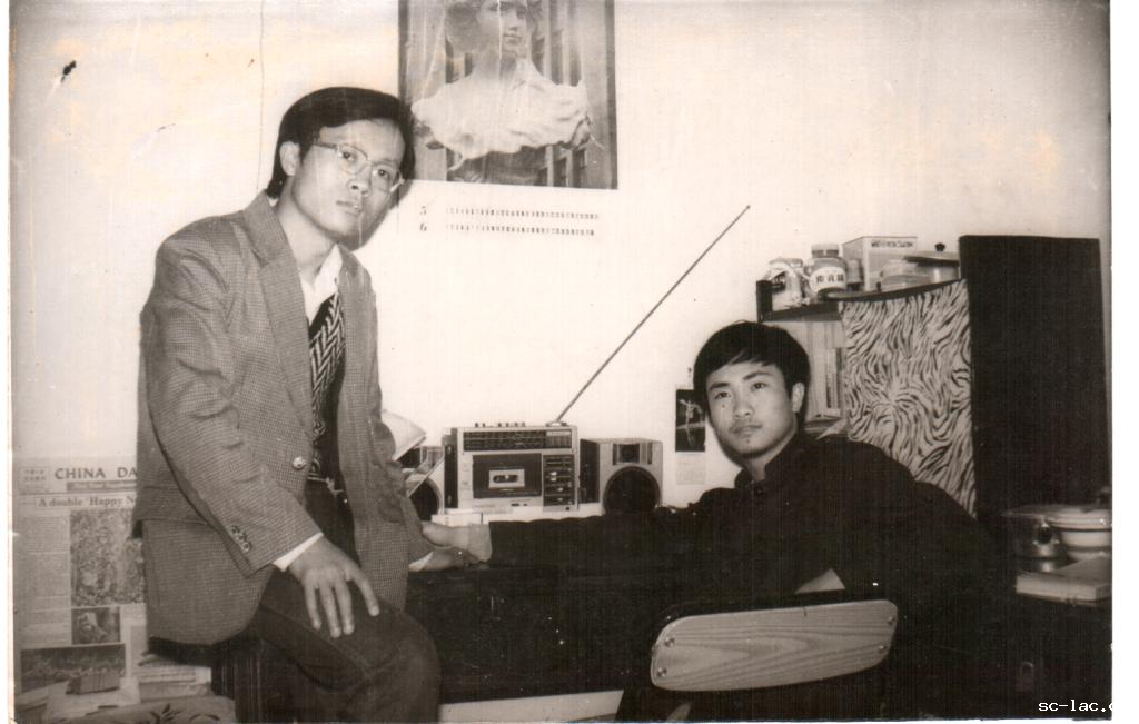 黄承锋(右)在寝室,桌上放着当时时髦的收录机