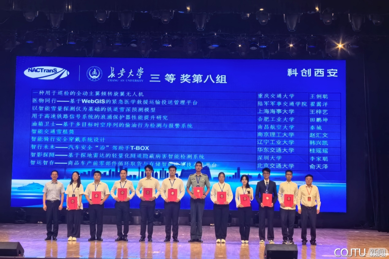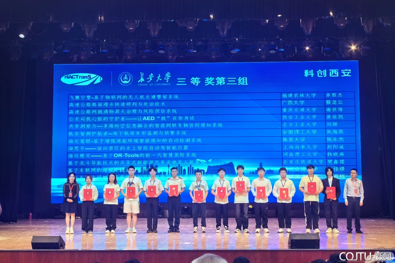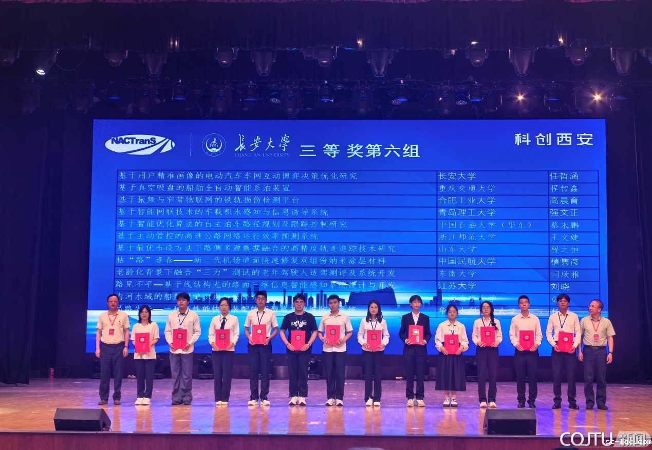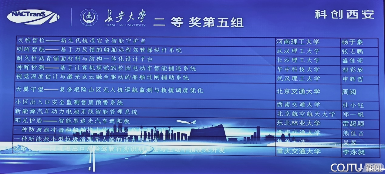 2024年5月24—26日,由中国交通教育研究会、中国交通运输协会、教育部高等学校交通运输类专业教学指导委员会主办的“科创西安”第十九届全国交通运输科技大赛决赛在长安大学举行,来自全国各地的159所高校提交了1186件参赛作品,经专家组评审,79所高校242件项目进入决赛。现场答辩激烈精彩,我校进入决赛的10件作品全部获奖,取得了参加全国交通运输科技大赛以来入围决赛数量最多的佳绩,其中全国一等奖1项,二等奖3项,三等奖6项。获奖作品中交通运输学院获得6项,航空学院获得3项,航运与船舶工程学院获得1项。