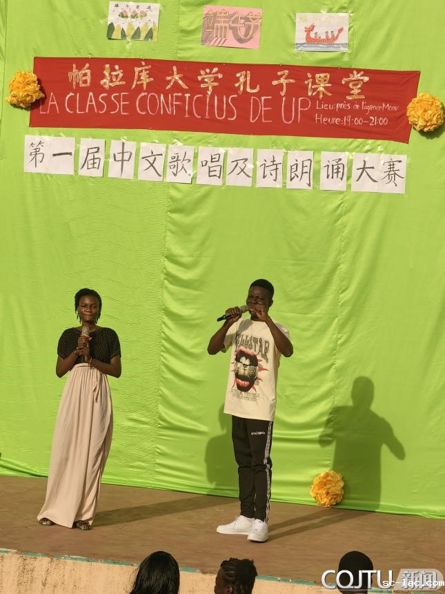 比赛在“南北谣”的歌声中开始,兰老师唱着“甜粽香,过端阳,豆沙轻轻蘸白糖”,轻快上台,与本土教师安杜一起用中法文主持比赛。选手们自信上台,简单的中法文自我介绍后开始演唱,或悠扬或激越的歌声依次响起,现场观众或喝彩或跟唱。学生JOSEPH演唱《你是我的小苹果》时,还现场邀请一位同学上台给他伴舞;学生CEIHESMA演唱《我们不一样》,观众们纷纷跟唱“我们不一样”,似乎都理解了这句话。两位朗诵古诗的选手都穿上了汉服。比赛持续一个半小时,3名优秀歌手脱颖而出,获得奖品和一万西法的奖金,其它参赛选手获得参与奖品。