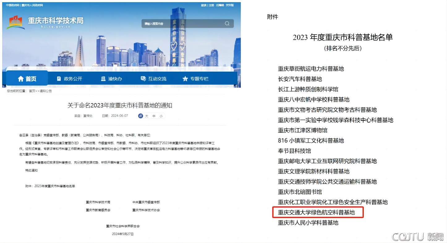 近日,重庆市科学技术局会同各有关单位,发布《关于命名2023年度重庆市科普基地的通知》,决定将包括老伟德网上娱乐绿色航空科普基地在内的45家科普基地命名为重庆市科普基地。