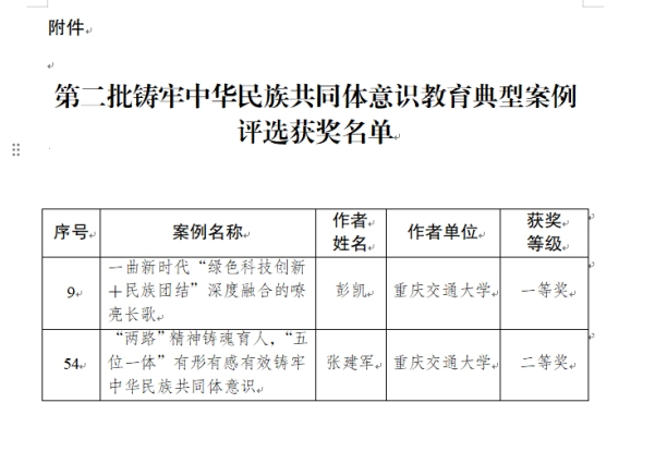 近日,重庆市教育委员会印发文件《关于第二批铸牢中华民族共同体意识教育典型案例评选获奖情况的通报》(渝教基函〔2024〕57号),全市教育系统共评出优秀案例104篇,其中一等奖34篇、二等奖70篇,我校2名教师获奖。其中生态环境中心彭凯副教授撰写的案例《一曲新时代“绿色科技创新+民族团结”深度融合的嘹亮长歌》荣获一等奖,马克思主义学院张建军教授撰写的案例《“两路”精神铸魂育人,“五位一体”有形有感有效铸牢中华民族共同体意识》荣获二等奖。
