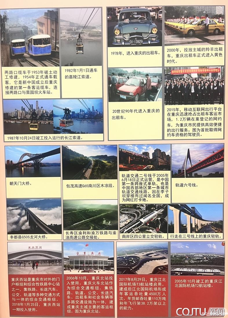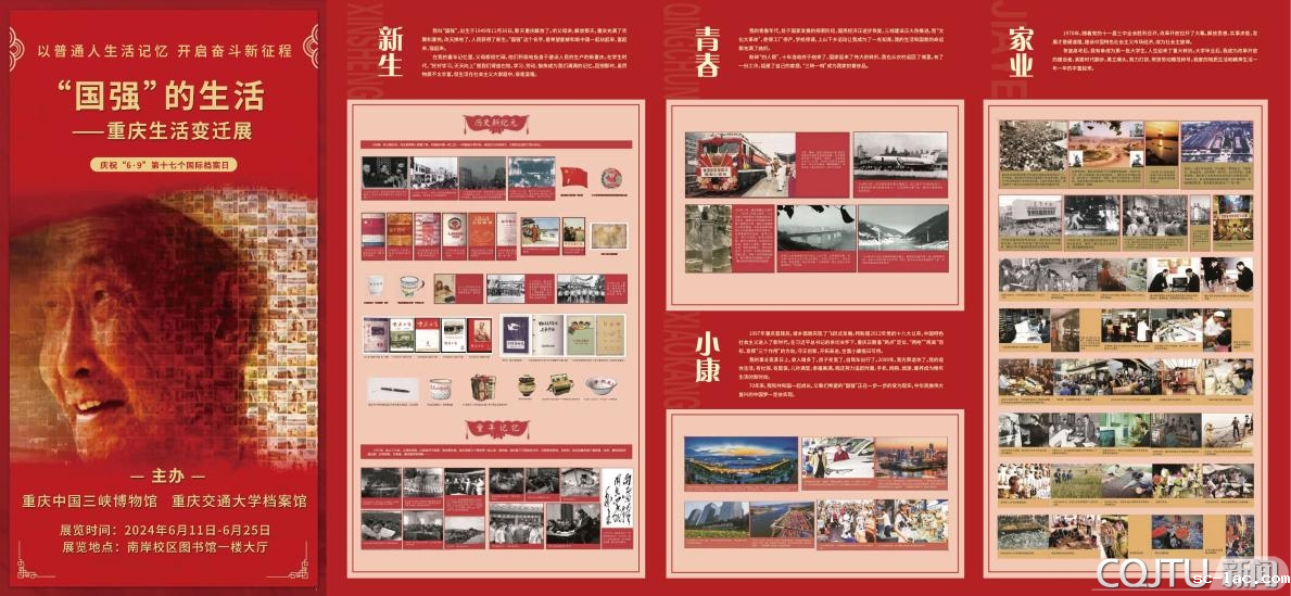 此次展览以新中国成立以来,重庆城市发展进程为背景,以主人公“国强”的个人成长经历为主线,通过“新生”“青春”“家业”“小康”四个部分,呈现500余幅珍贵图片档案,以微观视角切入,由人民生活发生的变化来反映解放以来重庆在经济、政治、文化、社会和生态文明等方面的建设成就,以小见大,形式新颖,将个人经历与社会变迁紧密融合,记录了解放以来重庆市民的集体记忆,引人入胜、发人深思。交通变迁的50余幅珍贵照片专版展陈,内容涉及嘉陵江长江大桥通车、朝阳桥建成通车、包茂高速建设、轨道交通等多个重点工程,与我校人才培养,科技创新紧密结合,引发师生长久的共鸣,参与互动。