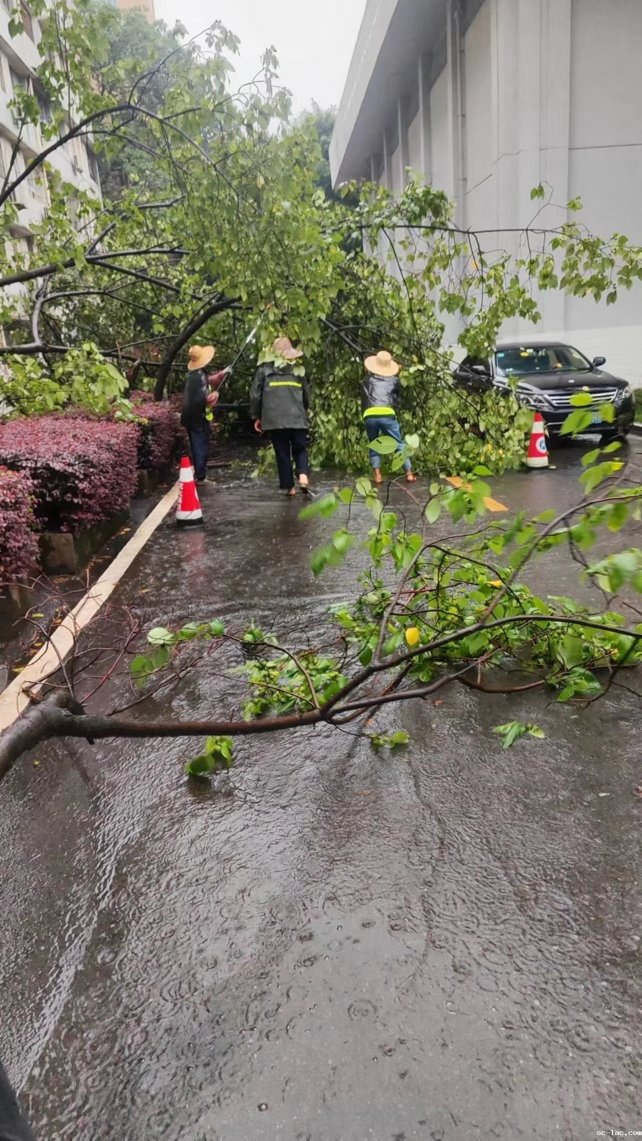 21日凌晨,教学楼、一食堂、明德楼车库通道、家属区等低洼处出现严重积水。同时,强风导致树木倒伏,部分道路受阻,家属区、港航楼前、青砖楼和红砖道路交通中断。面对突如其来的灾情,后勤应急小分队迅速启动应急预案,全力投入抢险工作。