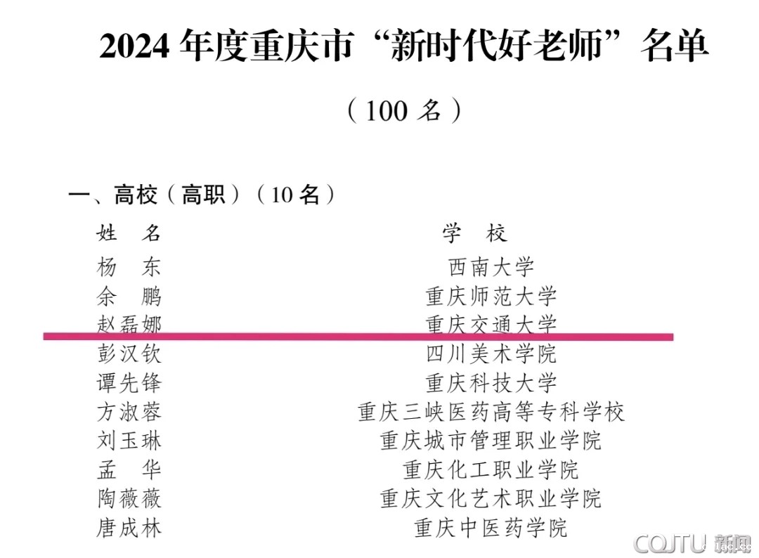 近日,由市委文明办、市教委、团市委、市妇联、市关工委联合开展重庆市 2024 年度“新时代好少年、好老师、好家长”学习宣传活动评选结果公布,我校赵磊娜老师荣膺2024年度重庆市“新时代好老师”称号!